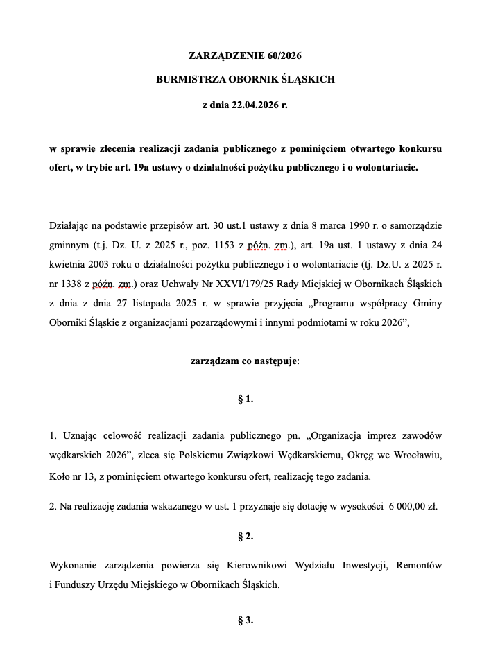 Jest decyzja burmistrza, jest zadanie publiczne i jest konkret: 6 tysięcy złotych na organizację zawodów wędkarskich w 2026 roku.